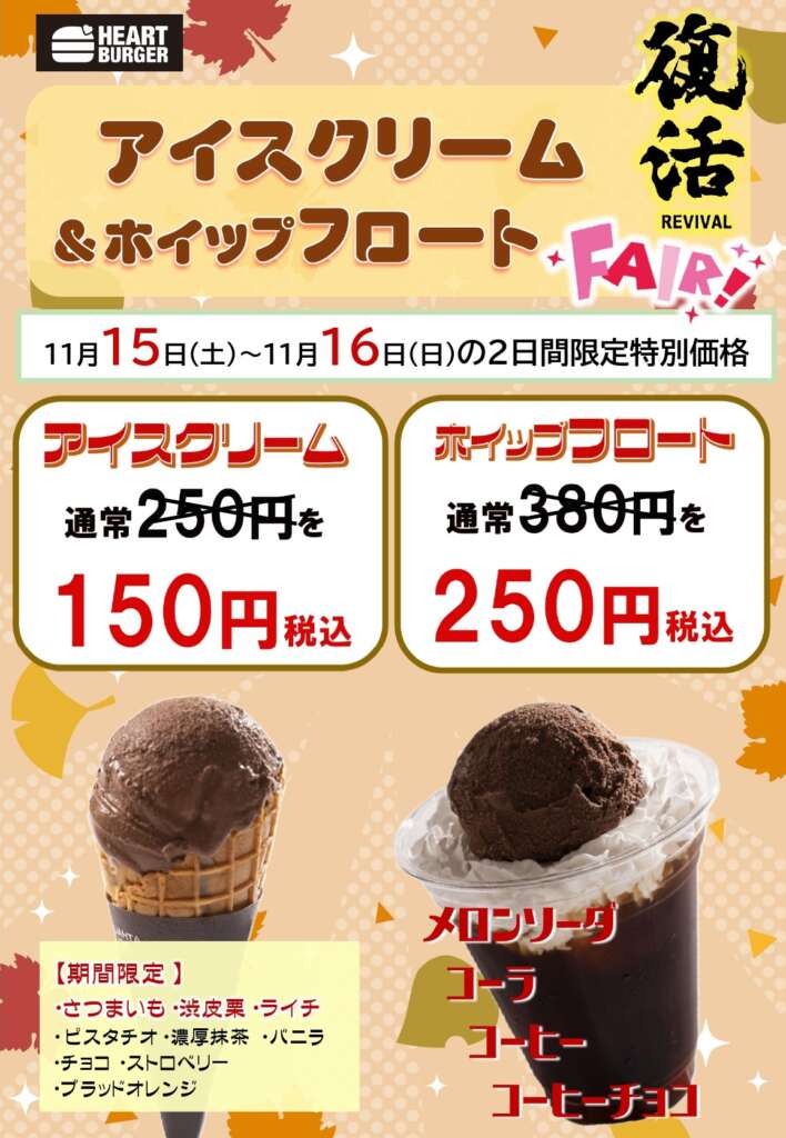 少し肌寒くなった秋の季節ですが、2日間はHOTなバーガーと冷たいデザートはいかがですか?