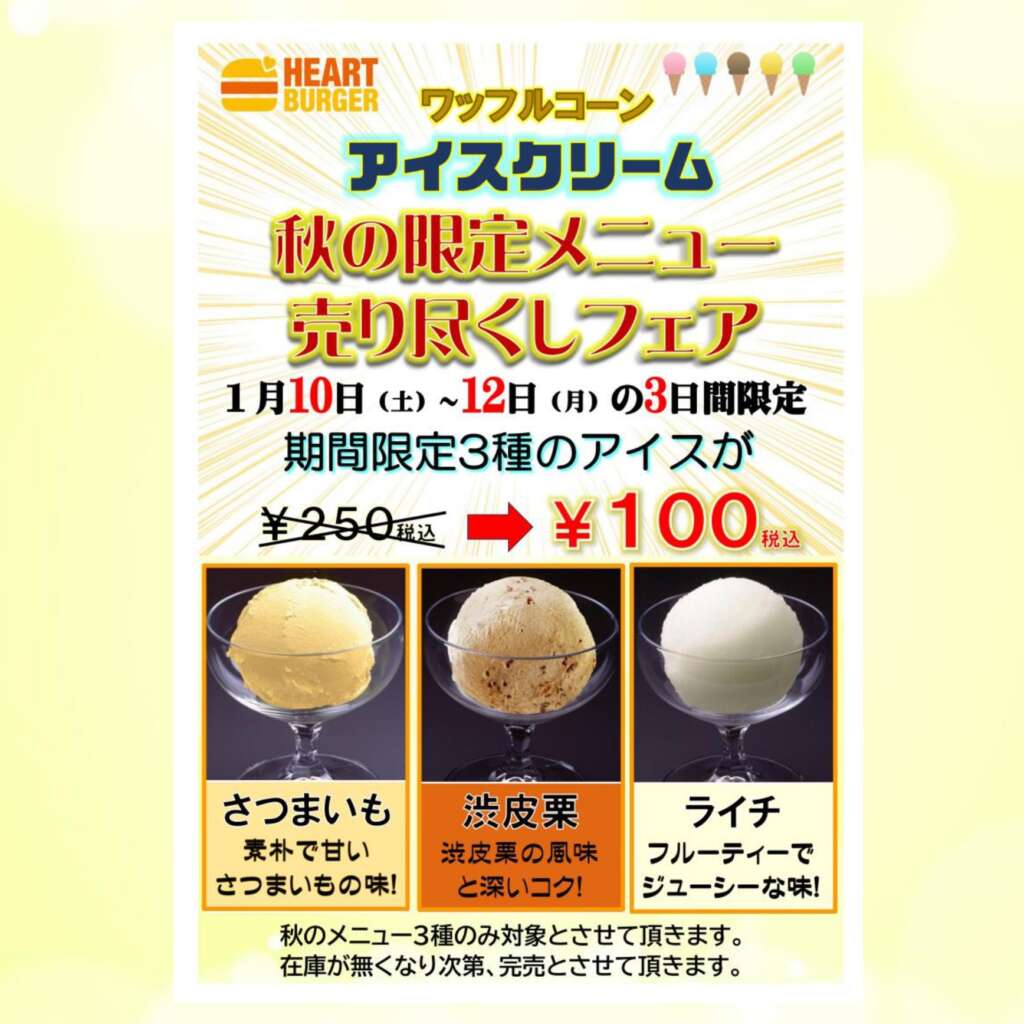 HEART BURGERでは1月10日(土)~12日(月)の3日間で秋限定アイスクリーム3種を100円で販売致します。